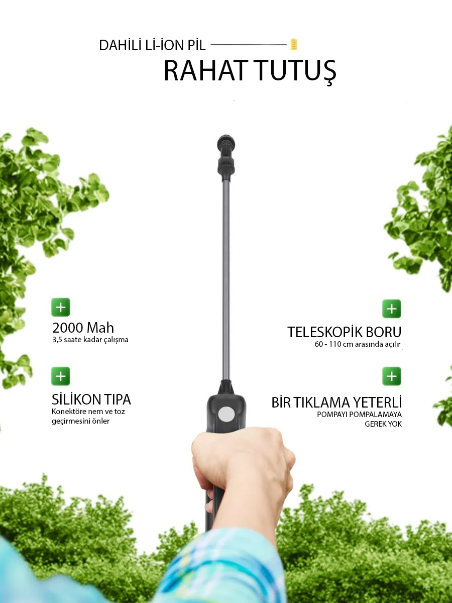 İlaçlama, dezenfeksiyon, gübreleme veya bitki besleme işlemleri için idealdir.